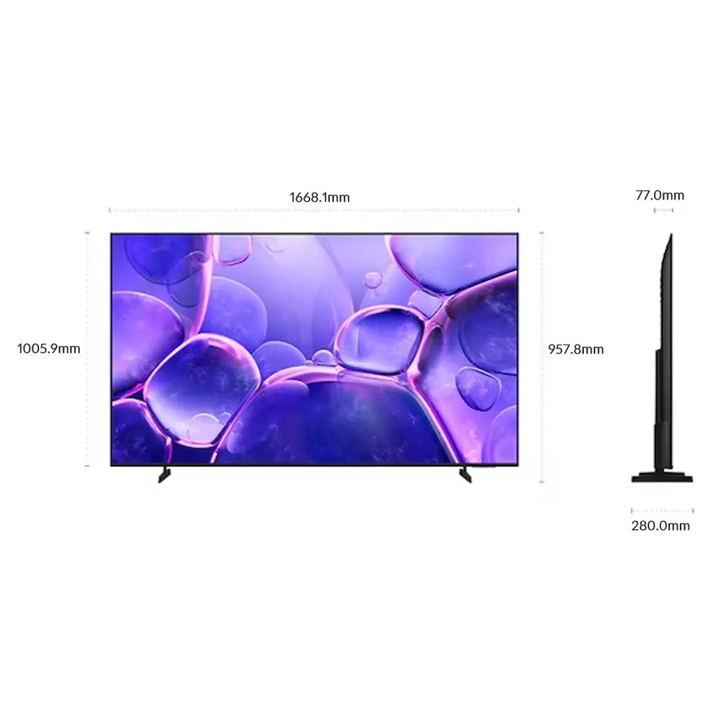 طراحی باریک و قاب مشکی تلویزیون U8000F باعث میشود هر فضای منزل مدرن و دلنشین به نظر برسد. سایز ۷۵ اینچ این مدل برای سالنهای بزرگ مناسب است و امکان نصب دیواری با استاندارد VESA 200×200، انعطاف و زیبایی بیشتری به دکوراسیون میبخشد.